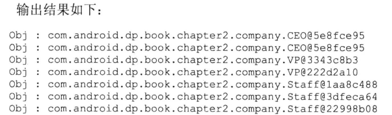 }从上述的代码中可以看到,CEO类不能通过new 的形式构造对象,只能通过CEO.getCEO()函数获取,而这个CEO对象是静态对象,并且在声明的时候就已经初始化了,这就保证了CEO对象的唯一性,从输出结果中发现,CEO两次输出的CEO对象都是一样的,而VP,Staff等类型的对象使不同的,这个实现的核心在于将CEO类的构造方法私有化,使得外部程序不能通过构造函数来创建CEO对象,而CEO通过一个静态方法返回一个静态对象。