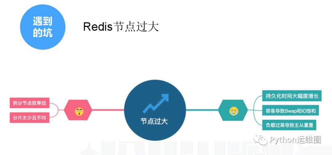 二、节点过大,部分是人为原因造成的。第一是拆分节点的效率较低,远远慢于公司业务量的增长。此外,分片太少。我们的分片是500个,codis是1024,codis原生是16384个,分片太少也是个问题。如果做自研的分布式方案,大家一定要把分片数量,稍微设大一点,避免业务发展超过你预期的情况。节点过大之后,会导致持久化的时间增长。我们30G的节点要持久化,主机剩余内存要大于30G,如果没有,你用Swap导致主机持久化时间大幅增长。一个30G的节点持久化可能要4个小时。负载过高也会导致主从重置,引起连锁反应。