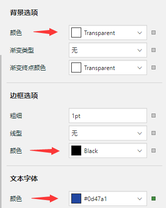 选中某个元素时,设计器右侧的选项列表会根据元素类型动态变化。每个元素可能有多种【颜色】选项,比如背景色、字体颜色、边框颜色等,如下图: