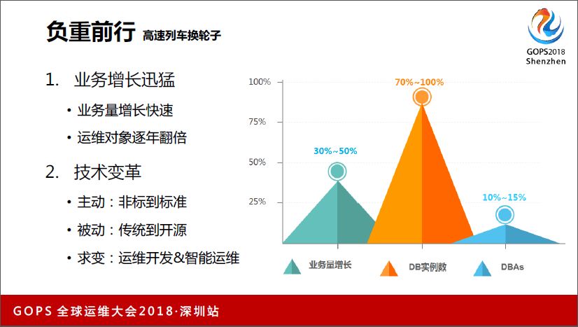 今天主题是“负重前行—顺丰数据库运维的求变之路”,为什么说负重前行?传统的公司做互联网转型历史包袱非常重,尤其是在顺丰业务高速发展的过程中,这种转型就像在高速列车上换轮子一样,风险很高。