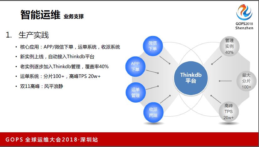 这里讲一下我们Thinkdb在顺丰的运用情况,目前我们多套核心应用都纳进去了,包括微信下单,运单系统,收派系统等等,然后新实例上线,会自动接入Thinkdb平台。老实例逐步改造,加入Thinkdb管理,目前覆盖率40%。