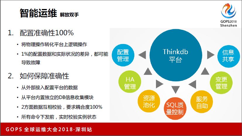 我们通过3个维度来保障准确性,第一:thinkdb会接入外部配置平台的数据,第二:thinkdb内部会通过jdbc轻量级的获取相关数据,这两方面的数据互相校验,要求耦合度100%,第三:是在所有命令下发之前,会实时校验实例状态,一定要保证此时此刻的实例状态和实际情况一模一样。