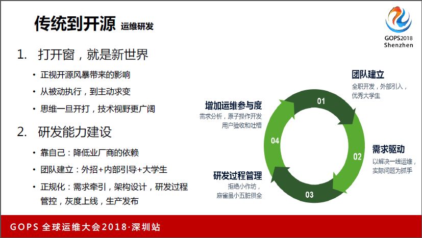 第一,既然是去商化,SAN也是要干掉的,所以我们开始着手做自己的运维研发的转型。我们花了半年左右的时间逐步打造自己的研发团队,从外部招了一些相对经验丰富的运维研发人员,两三个,然后带着我们自己内部的大学生;因为大学生是一张白纸,一个有经验的人带着大学生往前冲,出成果的几率比资深运维转研发的几率更高。