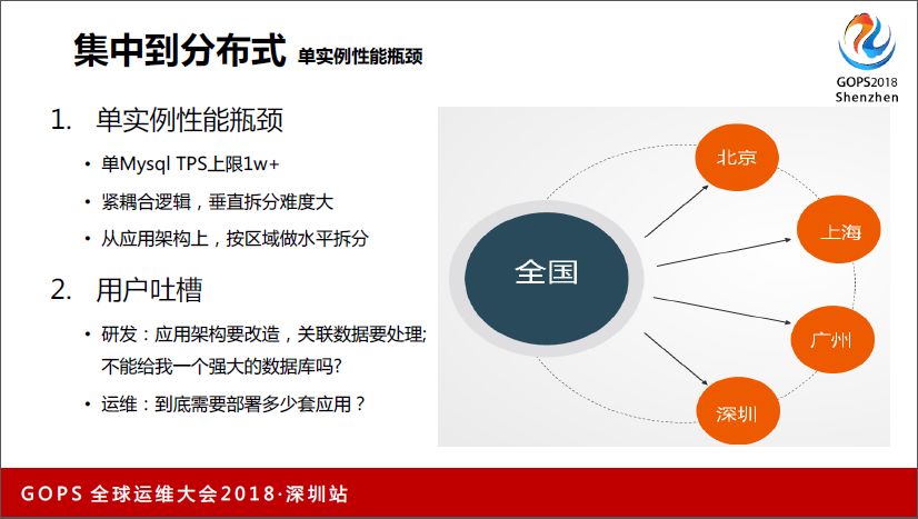 这种情况下我们进行了区域拆分,把全国的数据拆到北京、上海、广州、深圳,拆了很多出来,但这样对运维和研发压力很大。