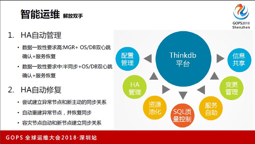 其次谈下HA的自动管理,我们建立运维研发体系,第一个目标就是开发自己的HA架构,达到去SAN的目的。我们底层数据一致性是通过MGR来保障,这个功能推出的时间不长,我们通过POC可以满足我们的基本需求,就大胆的用起来。对数据库一致性的要求高的系统,我们通过MGR+OS/DB双心跳确认+服务恢复,来自动恢复服务。
