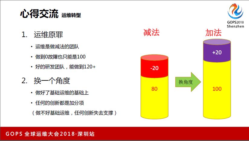 运维是有原罪的,因为运维是做减法的,传统意义上看,零故障情况下就到顶100分了,你做不到120分,但研发做项目可以做到120分、200分。