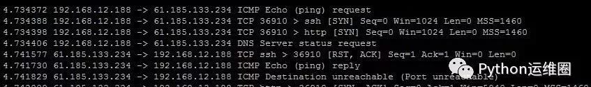 在图 2-25 中可以看到,nmap 所在的主机 192.168.12.188 向目标主机 61.185.133.234 发送了四个探测包,分别是 ICMP Echo (ping)、22 端口和 80 端口的 TCP SYN、53 端口的 UDP 包。但是仅仅收到了 ICMP Echo (ping)和 80 端口的回复,22 端口返回了“RST”标识,这说明 22 端口处于关闭状态。不过 nmap 的原则是只要能收到任何一种探测请求的回复,就认为此主机处于在线状态。