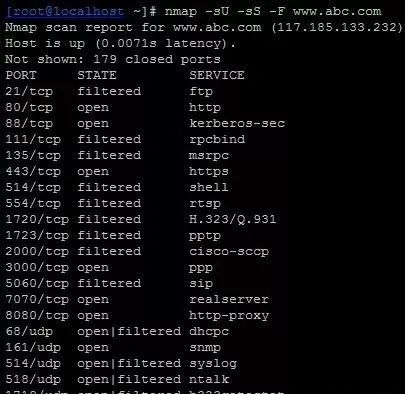 在图 2-26 中,参数“-sS”表示使用 TCP SYN 方式扫描 TCP 端口,“-sU”表示扫描 UDP端口,“-F”表示使用快速扫描模式,扫描最可能开放的前 100 个端口(TCP 和 UDP 各 100个端口),由输出可知,有 21 个端口处于开放或者屏蔽状态,其他 179 个端口处于关闭状态。