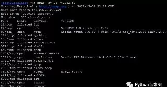 下面以探测 23.76.232.59 主机上运行的应用程序的版本信息为例,简单演示版本侦测的使用方法。首先,在联网的服务器上执行如下命令: