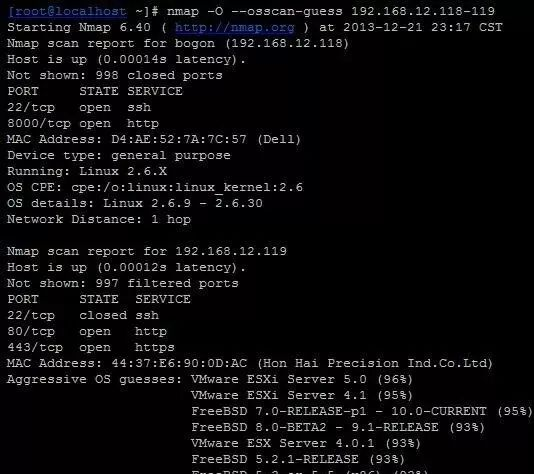 从图 2-28 中可以看出,在指定了“-O”选项后,nmap 命令首先执行了主机发现操作,接着执行了端口扫描操作,然后根据端口扫描的结果进行操作系统类型的侦探,获取到的信息有设备类型、操作系统版本、操作系统的 CPE 描述、操作系统的细节和网络距离.如果不能确定操作系统的版本,会猜测每个系统版本的可能性比率,例如对于192.168.12.119 主机,nmap 给出最可能的操作系统版本是 VMware ESXi Server 5.0,而事实上,此主机确实安装了这个版本的系统。由此可见,nmap 的操作系统侦测功能是多么的强大。