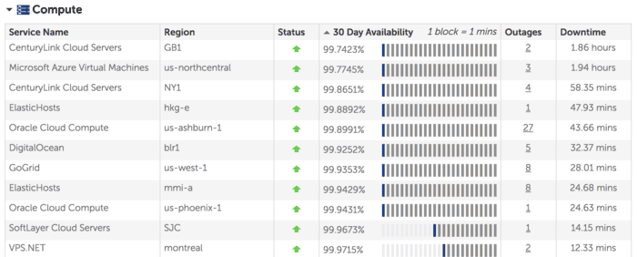 实际上,数据中心也没有想象中的那么稳定,下图是笔者2017年11月22日截取的cloudharmony监控数据,监控300多家数据中心的可靠性情况。