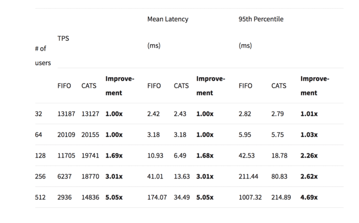 上图是mysql8.0.3 CATS特性的性能测试结果,明显可以看到超过64连接后,性能随着连接数增加而降低。