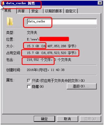 通过对网站进行大小查看,一个普通的网站竟然超过 20G,明显不正常,如图 11 所示,在 data_cache 中,黑客用来做 SEO 竟然高达 21.8552 万个页面,共计 15.3G。