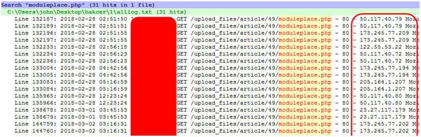 在日志中以文件名为关键字进行查看,如图 19 所示,可以获取曾经访问过该文件的 IP 地址,这些地址可以用来进行跟踪和案件打击。