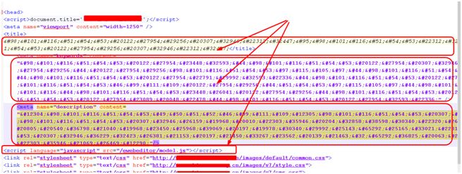 通过查看首页(index.html/index.php )源代码发现网站存在 3 处编码后的代码,如图 1 所示,分别在 title、meta 属性中加入了代码,对代码文件中的其他代码进行查看,未发现有异常。