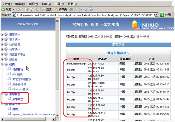 将 IIS 日志文件利用逆火日志分析软件进行分析处理,寻找漏洞和黑客 IP。