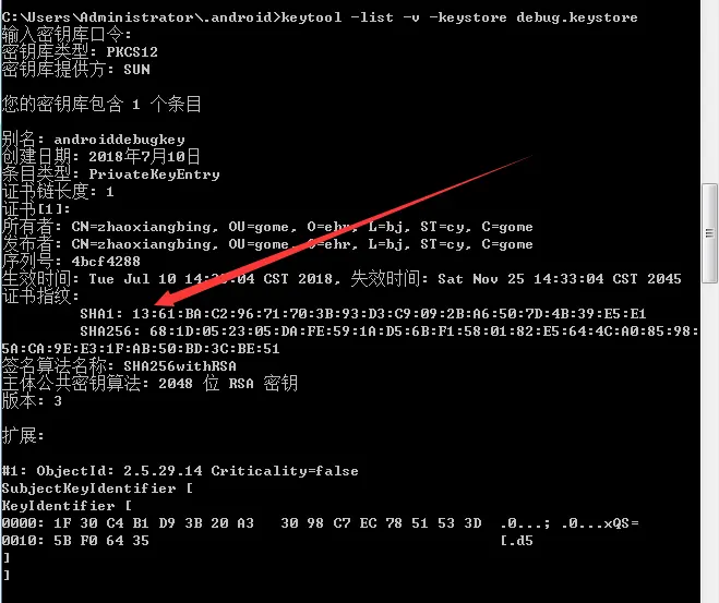 然后输入 keytool -list -v -keystore debug.keystore