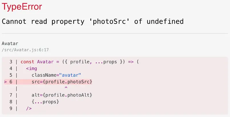 我们必须确保 Avatar 组件本身是可靠的,并考虑到所需要的属性父组件可能不会传递的情况。在这种情况下,除了在使用 profile 之前检查它是否存在之外,还要使用 Flow、TypeScript 或 PropTypes 对这种情况给出警告,如下: