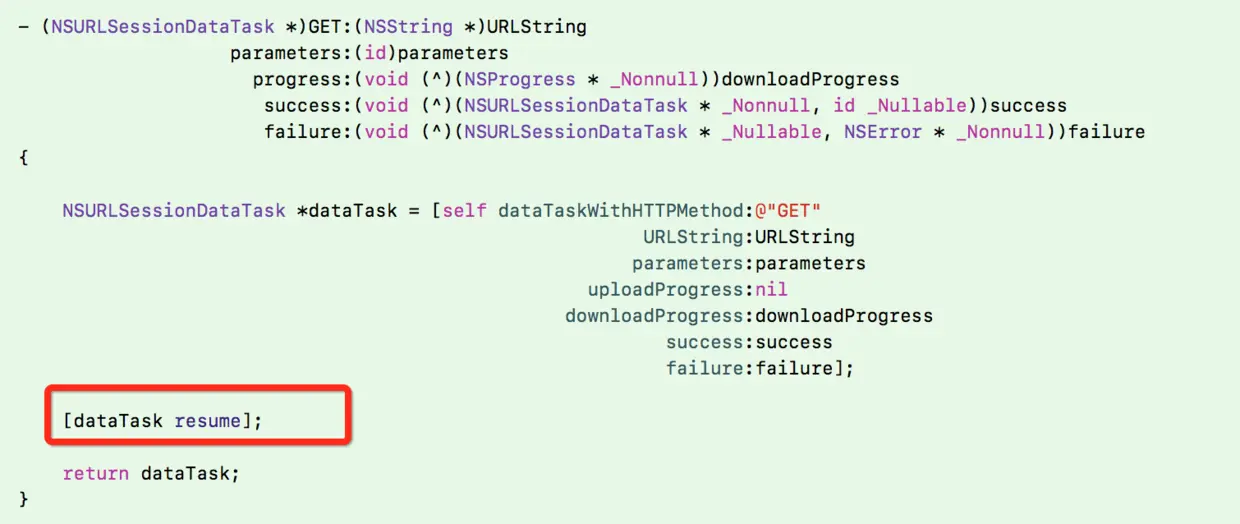 其中,【注解1】、【注解2】、【注解3】这三个方法得到的是同一个对象,即【注解3】中系统原生的NSURLSessionDataTask对象。所以,AF请求操作内部实现也是和原生NSURLSession操作一样,创建task,调用resume发送请求。