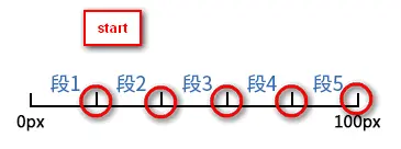 start:表示直接开始。也就是时间才开始,就已经执行了一个距离段。于是,动画执行的5个分段点是下面这5个,起始点被忽略,因为时间一开始直接就到了第二个点: