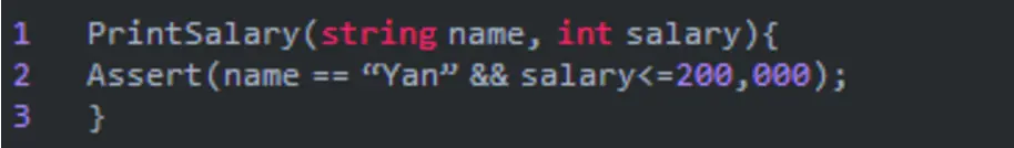 Assert的基本理念可以应对成一句话:“反常必有妖”。上面这段代码的含义是如果发现Yan赚的钱超过了20万,那程序一定是哪里出现问题了。就像你发现你的名字出现在福布斯富豪榜上了,那富豪榜一定是印错了。你最好复查一下计算薪水的代码。如果你再阅读一下上面计算salary的代码,你就会发现是重名的设计缺陷和if的实现缺陷才让Yan的salary那么多。