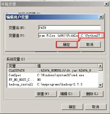 9、之后在弹出的“编辑用户变量”的“变量值”最后将刚刚复制的路径进行粘贴(快捷键是Ctrl+V)。特别需要注意的是在路径之前要添加一个分号,该分号是英文状态下的分号,表示与前边的路径分开,是另外一个路径。说白了,就在在变量值下输入“;C:\Python27”或者“;你的Python安装路径”即可。完成之后,一路点击确定即可。