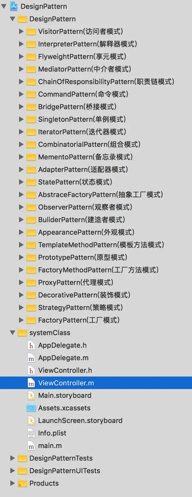 设计模式这个东西,感觉就跟太极一样,不是固定招式,需要学会然后忘记然后融会贯通。我看《大话设计模式》一书,前前后后大概看了一个月,看完一个自己用OC实现一个,到今天终于看完了。代码我已经上传到了GitHub,大家有兴趣的话可以下载看一眼,下面是代码目录