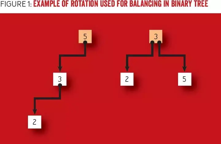 一种二叉树重平衡(rebalance)的法是称为“旋转”(rotation)方法。旋转方法实现节点的重新排列,它将更深子树的父节点下推到其子节点之下,并上移子节点为有效地置于父节点的原位置。图 1 给出了一个旋转方法的例子,实现了一个二叉树的平衡。左图的二叉树在添加了节点“2”之后,是不平衡的。为了平衡二叉树,我们以节点“3”为轴心旋转树,然后以节点“5”为轴线。节点“5”是原先的根节点,也是节点“3”的父节点,旋转后成为节点“3”的子节点。在完成旋转后得到右图的树,其中左子树深度降低了 1,右子树的深度增加了 1,而树的最大深度降低了。