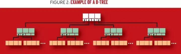 二叉树是一种十分有用的内存数据结构。由于平衡(即需要保持所有子树的深度最小)和低扇出(每个节点最多具有两个指针)特性,二叉树在磁盘上的性能并不好。B 树允许每个节点存储两个以上的指针,并可将节点大小调整为适合页面的大小(例如,4KB),因此可在块设备上良好工作。当前,有一些实现中使用了更大规模的节点,甚至横跨多个页面。