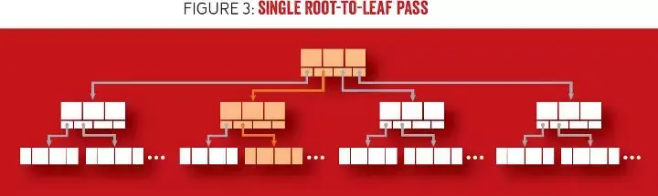 在执行查找时,搜索将从根节点开始,沿内部节点递归下行至叶子层级。在每一层级,通过追随子节点指针,搜索空间可缩减到子树范围(该子树包括搜索值)。图 3 显示的是 B 树中的一次查找,即一次沿着两个键间的指针由根到叶子的遍历,一个指针大于或等于搜索项,另一个指针小于搜索项。执行一个点查询(Point Query)时,搜索在定位到叶子节点后结束。在范围搜索中,会遍历所找到叶子节点的键和值,然后是近邻的叶子节点,直到到达范围的终点。