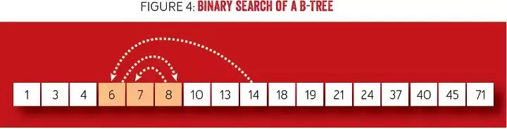从复杂性上看,B 树保证了 log(n) 复杂度的查找,因为如何从节点中找到键中使用了二分查找法,如图 4 所示。二分查找法易于解释,当从字典中搜索具有某个首字母的单词时,所有单词是按字母顺序排列的。首先选择从确切的中间位置打开字典。如果搜索字母在字母序上要“小于”(先出现)打开的字母,那么继续在左半部份字典中搜索。否则,在词典右半部份中搜索。然后继续缩减剩余页面范围,通过减半并选择搜索方向,直到找到所需的字母。每步将搜索空间减半,使查找呈对数时间复杂度。B 树中的搜索具有对数时间复杂度,因为节点层级键是排序的,并在查找匹配总使用了二分查找。这也是为什么在整个树中保持高利用率和一致性是非常重要的。