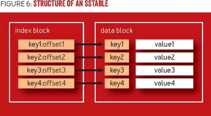 SSTable 是一种不可变的、驻留磁盘的排序数据结构。如图 6 所示,SSTable 在结构上可分为两个部分,即数据块和索引块。数据块是由顺序写入的唯一键值对组成,键值对按键排序。索引块中的键包含映射到数据块指针,指针指向实际记录的位置。索引通常实现为针对快速搜索优化的格式,例如 B 树,或是对于点查询使用哈希表。SSTable 中的每个值项具有一个与之相关联的时间戳。时间戳指定了插入和更新的写入时间(通常不做区分),以及删除的移除时间。
