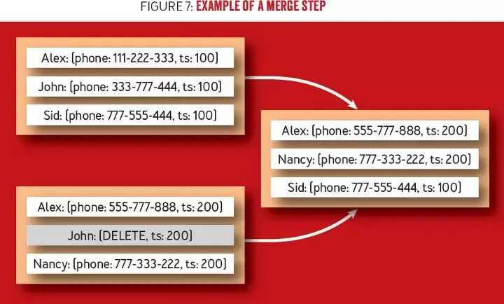 为确保实现删除和更新,也必须要合并步骤。删除时,会在 LSM 树中插入一个占位符,通常称为“墓碑”(tombstone)。墓碑用于标记被删除的键。类似地,更新时也仅是增加一个具有更迟时间戳的记录。在读取期间,将跳过被标记为删除的记录,不返回给客户。更新中也采取类似的做法,对于两个具有同一键的记录,只返回时间戳更晚的记录。图 7 显示了合并是如何整合存储在独立表中具有同一键的数据。如图所示,Alex 的记录写入的时间戳为 100,更新了电话后记录的时间戳为 200。John 的记录是被删除的。其它两个条目保持原状,因为它们并未做标记。