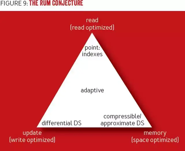 哈佛大学 DASlab(数据系统实验室)的研究人员总结了数据库系统优化的三个关键参数:读开销、更新开销和内存开销,统称为“RUM”。对于特定的用例,理解这些参数中哪个是最重要的,将对数据结构、访问方法,甚至是特定工作负载的适用性产生影响,因为算法需要根据特定的用例做出调整。