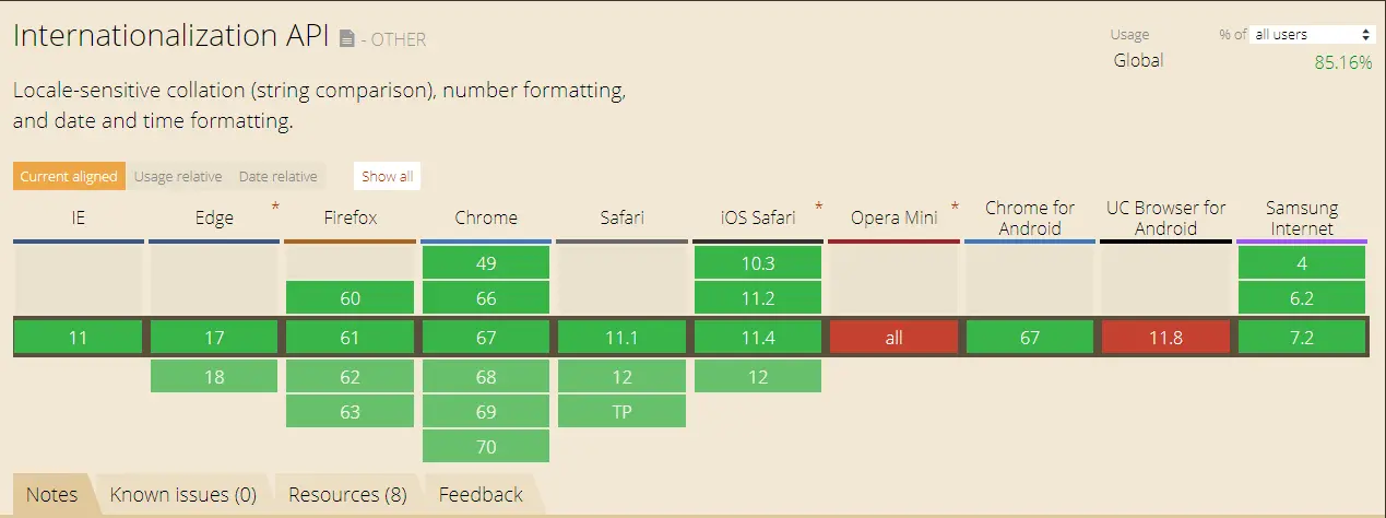 作为前端开发人员,我们必须考虑到浏览器和平台的多样性。 React Intl 使用浏览器 Intl API 来处理DateTime 和 Number 格式。尽管这些 Intl API 早在2012年就提出了,但并不是所有现代浏览器都支持它, 甚至Safari也只有在iOS 10之后才部分支持它。