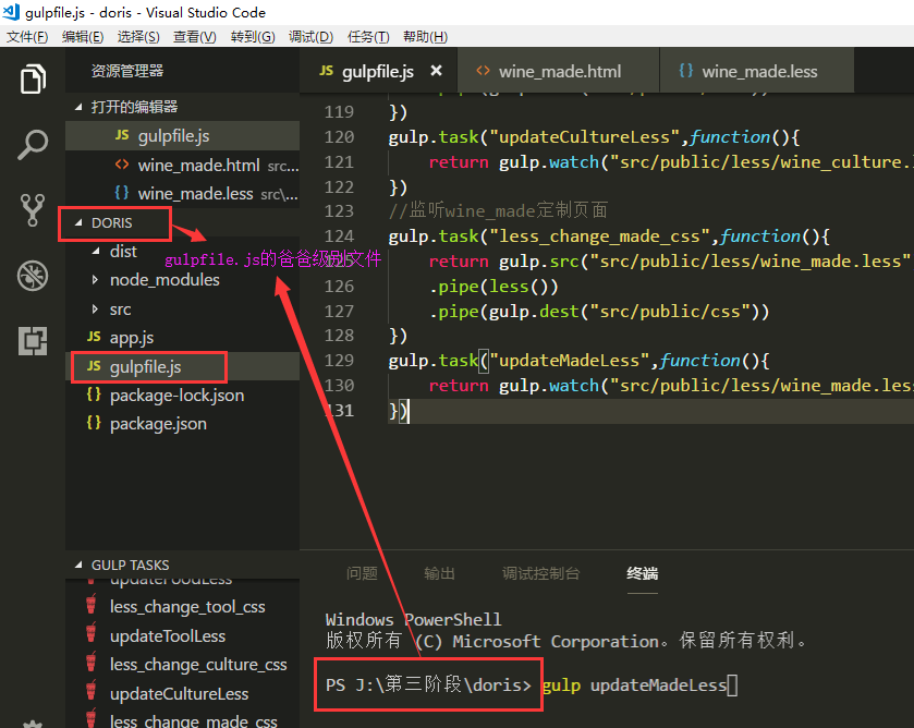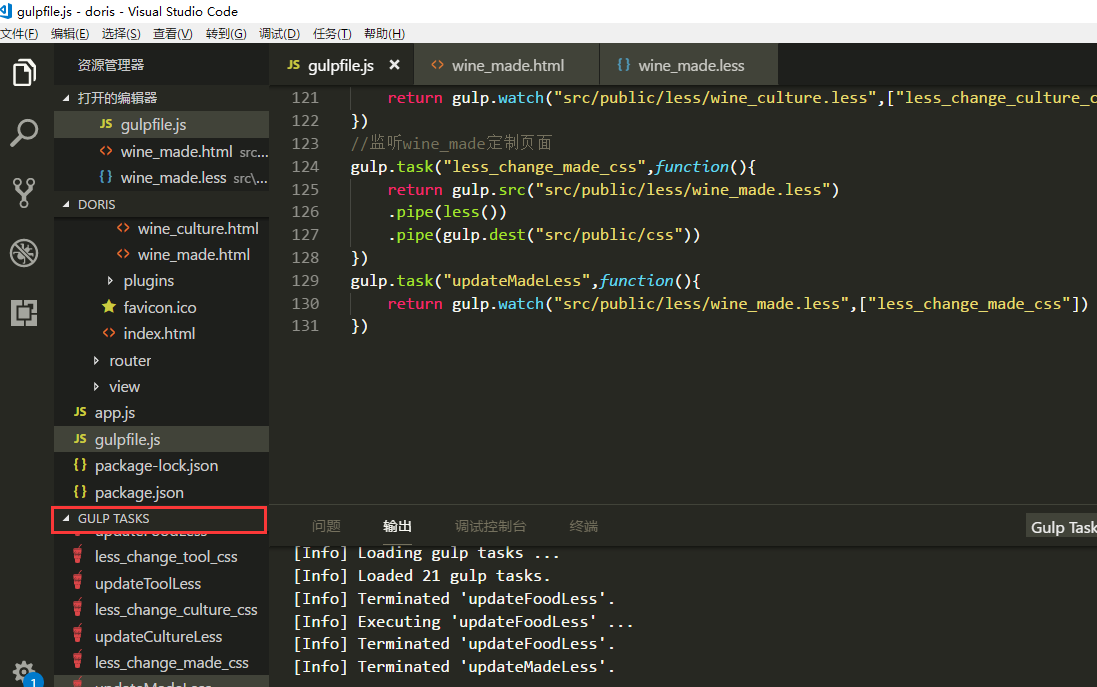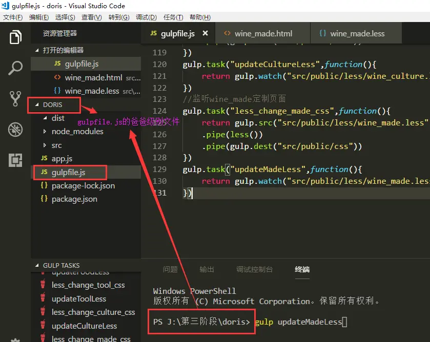 配置好gulp以及写好任务后,执行任务方法如下: 1、可以用gulp tasks这个工具栏,会自动识别你所有的gulp任务名,选择执行即可 2、在powershell可以直接输入gulp+任务名字,注意:这里需要高度注意,必须是根目录下输入命令,否则路径是不对的,会报错说这个文件里找不到gulp,前提你是全局安装以及依赖安装过还报这种错误的话。 如果不在当前根目录下,意思是可能是在gulpfiles的“爷爷”路径(这个问题可能是建gulpfiles文件的时候路径就错了),通过输入 cd xxx(gulpfiles的“爸爸”文件名)回车,进入gulpfiles的根目录下,然后再输入 gulp+任务名 执行任务