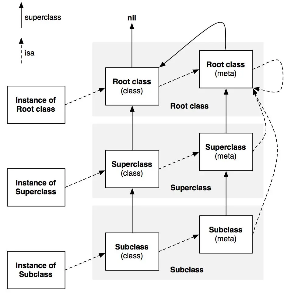- meta-class 的 superclass指向父类的 meta-class。基类的 meta-class 的 superclass 指向基类的 class