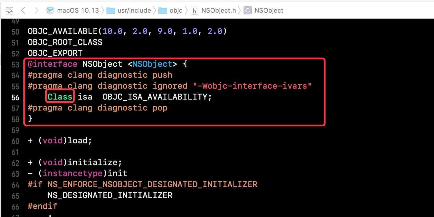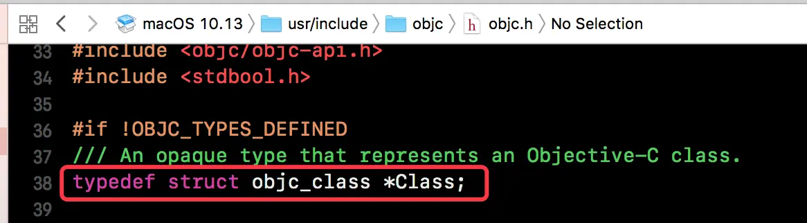 上面我们已经知道了一个 NSObject 对象实际上就是一个 C/C++ 的结构体,并且这个结构体里面只有一个 isa,我们可以看到它的类型是 Class。那么现在的问题就是这个 Class 类型是什么,它占多少内存?