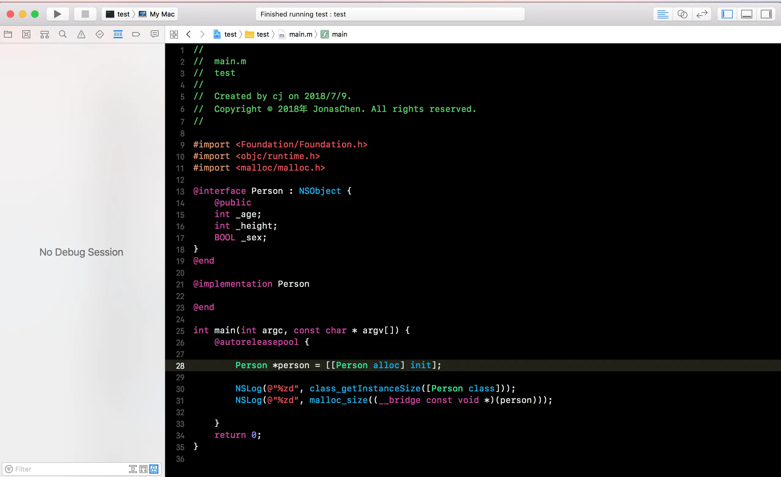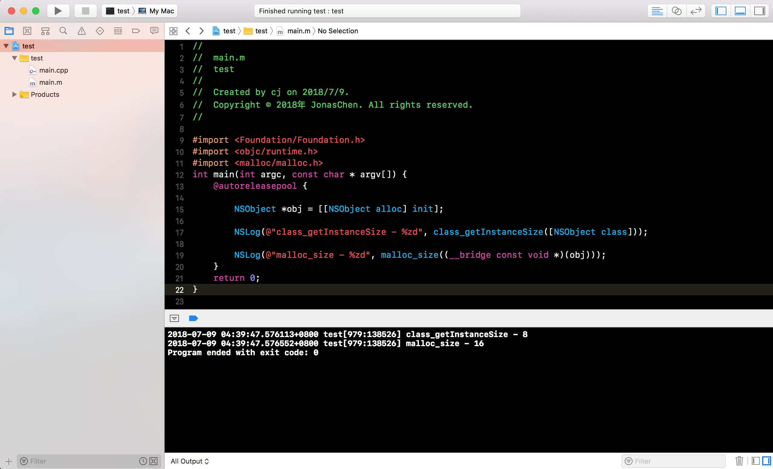 根据结构体内存对齐规则,我们可以得出Person_IMPL结构体在对齐后占用16个字节,所以class_getInstanceSize([Person class])为16。运行后发现打印的两个值都是16。