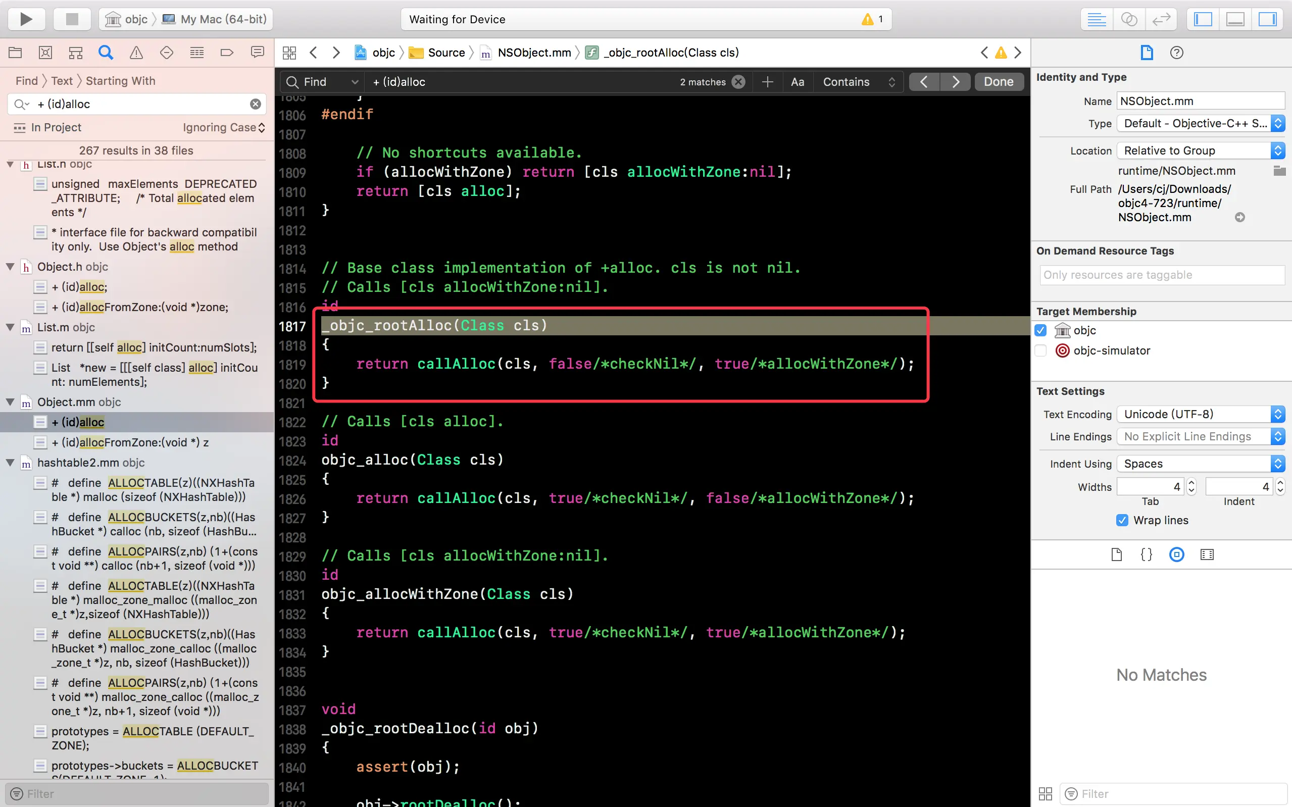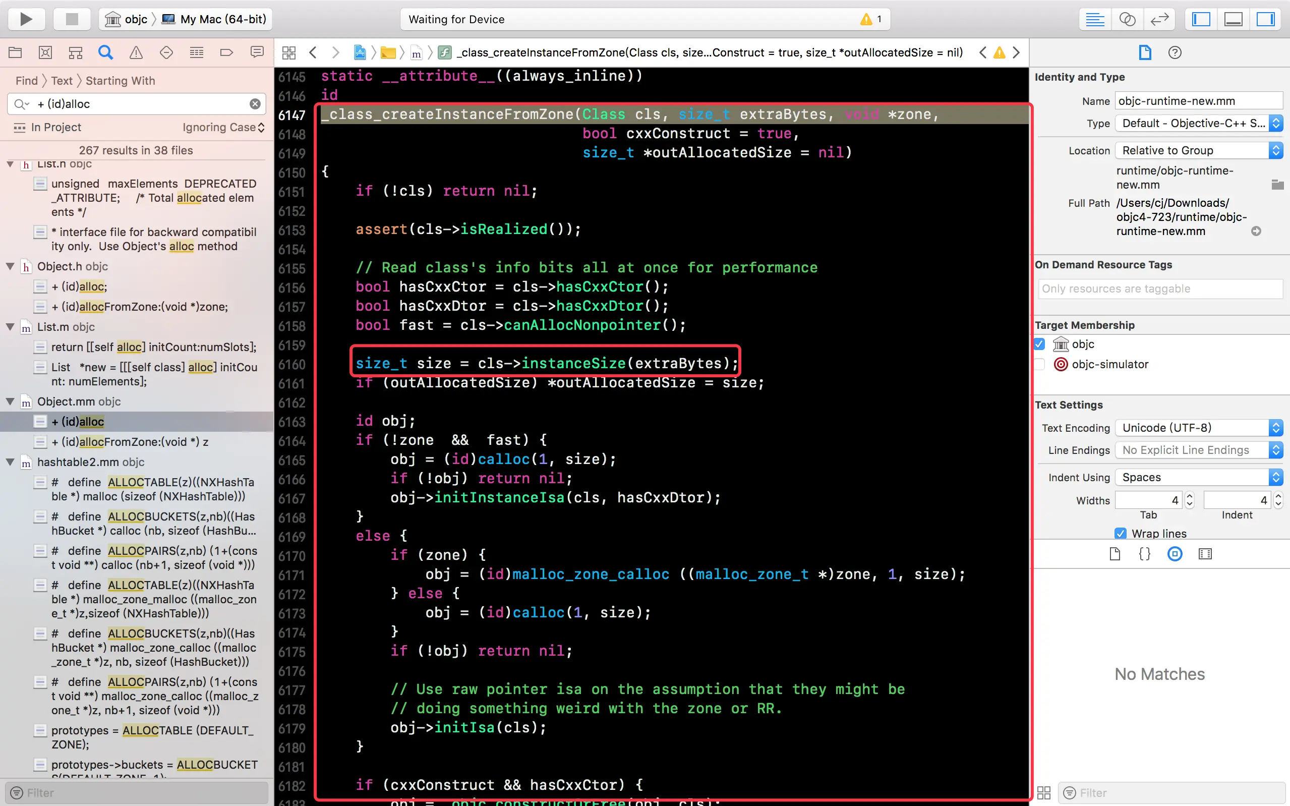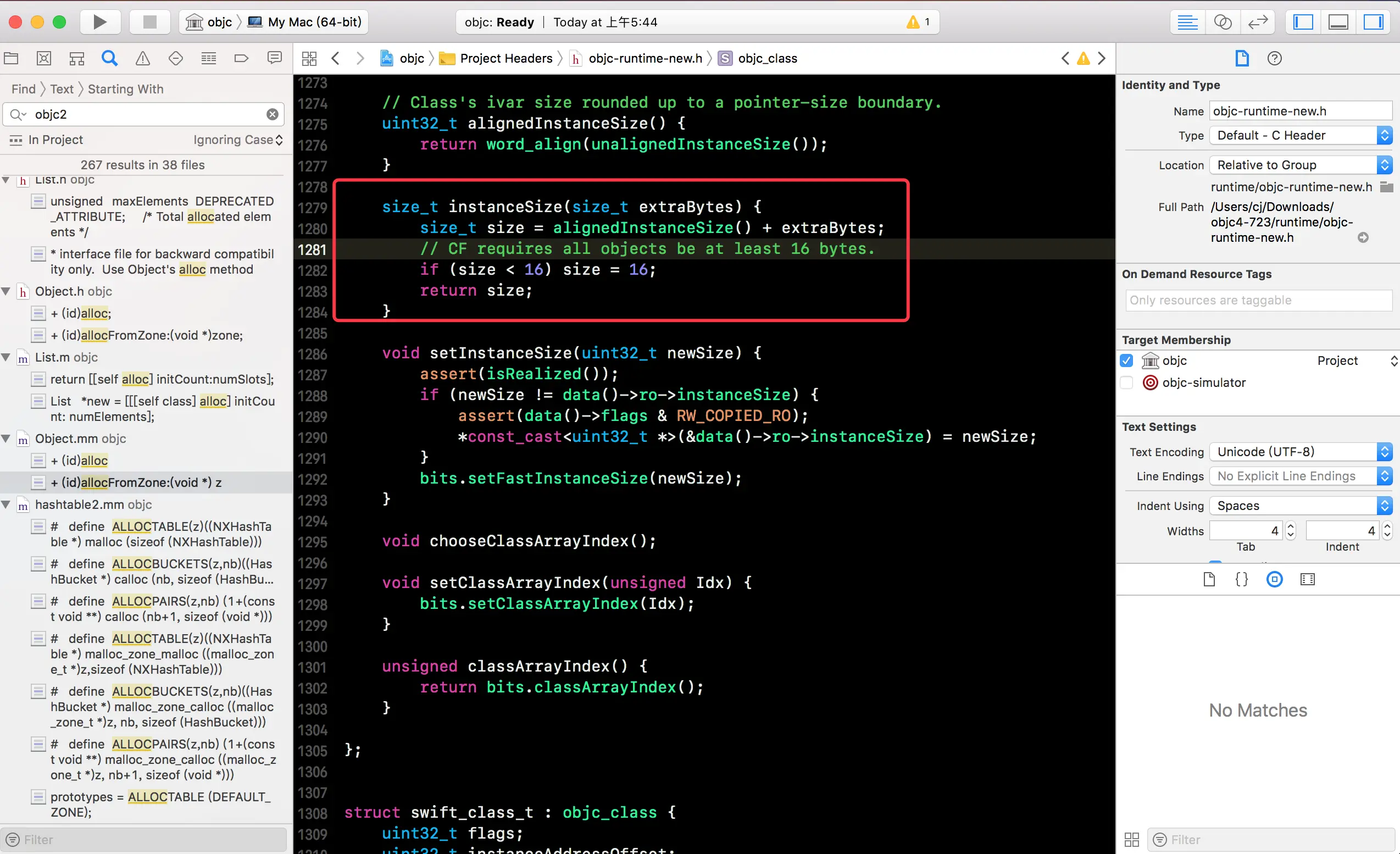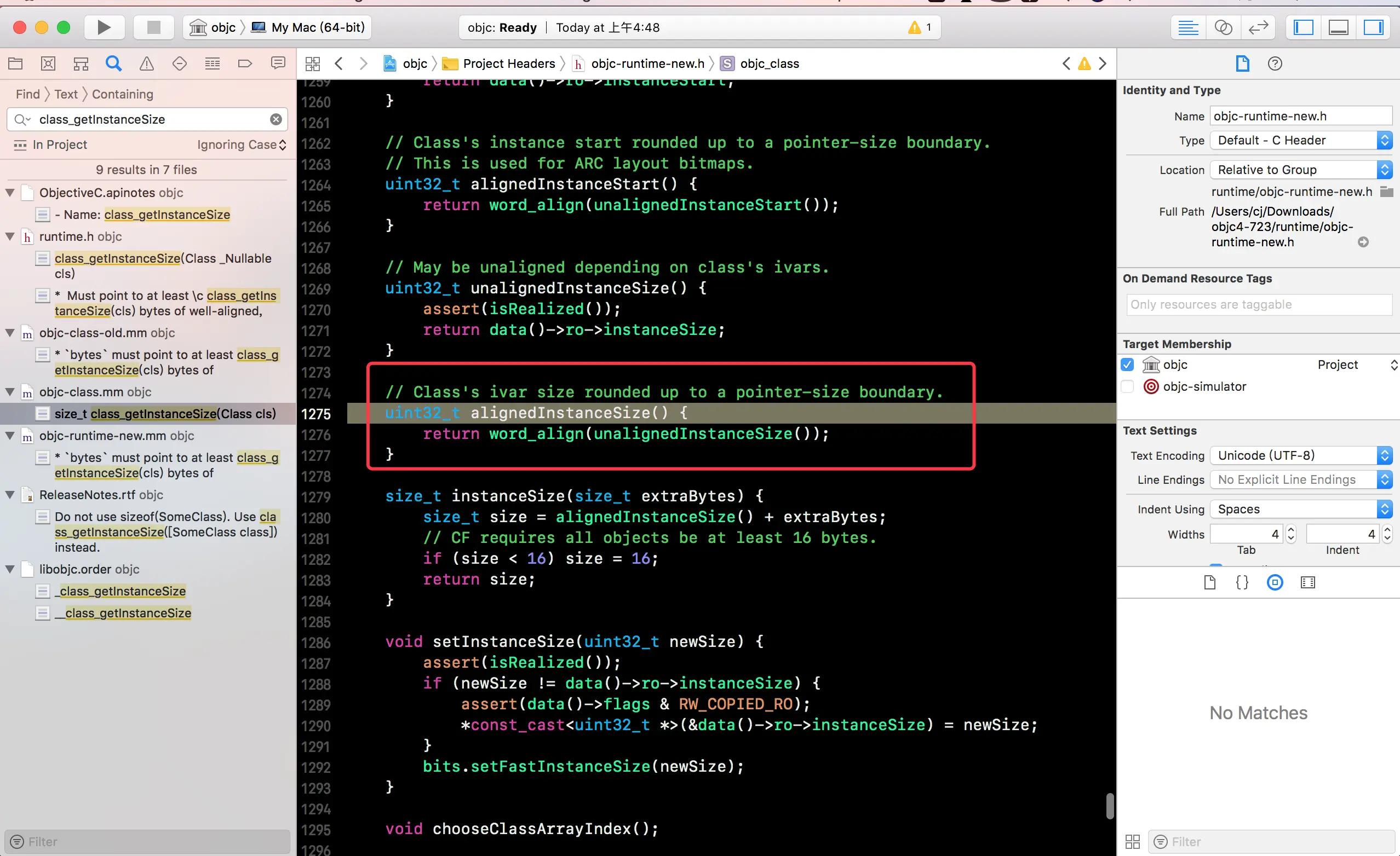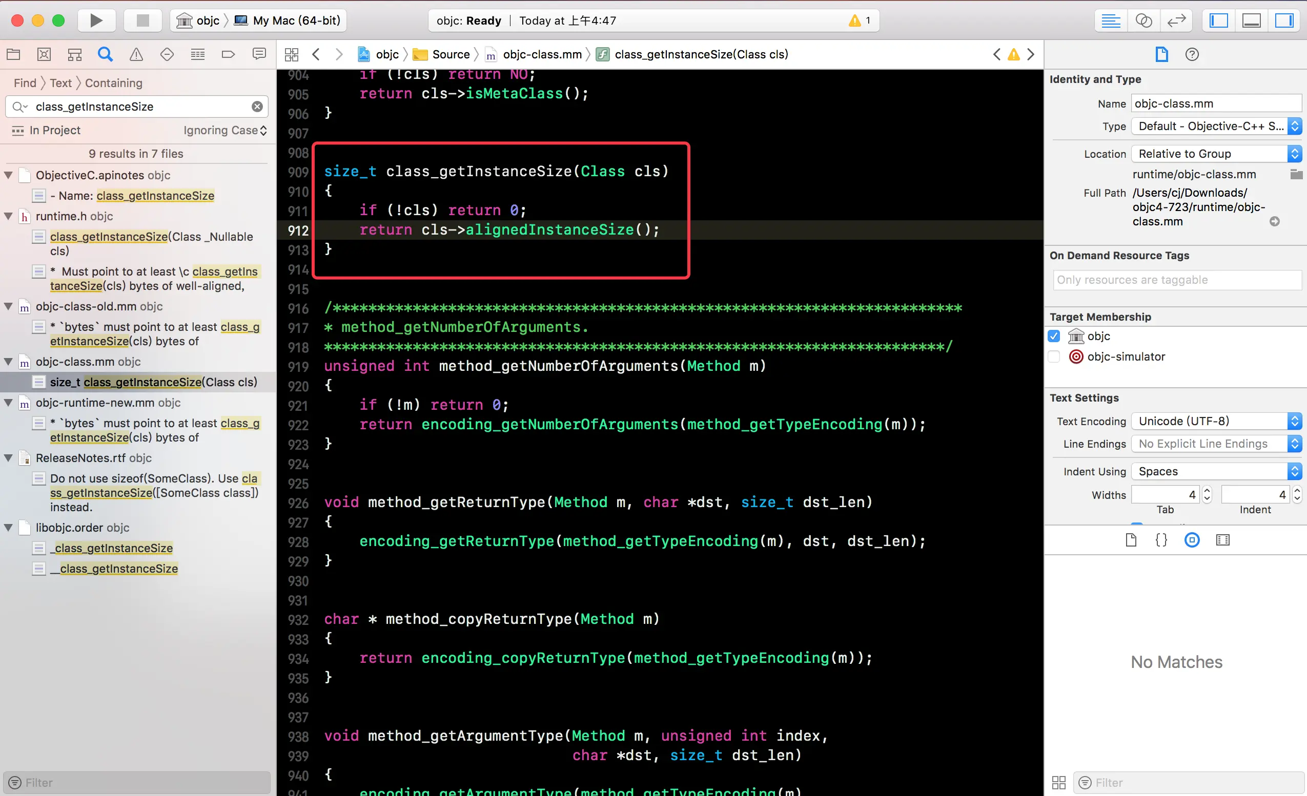 先在苹果的开源网站 opensource.apple.com/tarballs/ob… 下载最新的 OC 底层源码(数字最大就是最新的),解压后用 Xcode 打开项目,全局搜索class_getInstanceSize,找到它的实现方法: