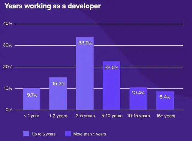 超过一半的受访者表示其作为开发人员工作的时间不到 5 年,2-5 年工作经验的占 33.9%,1-2 年的占 15.2%。本报告受访者的工作经验比参加 StackOverflow 调查的开发者要少一些。然而,“开发者数量每 5 年翻一番”的传统理念依旧存在,未来 Kotlin 的开发者只会越来越多。
