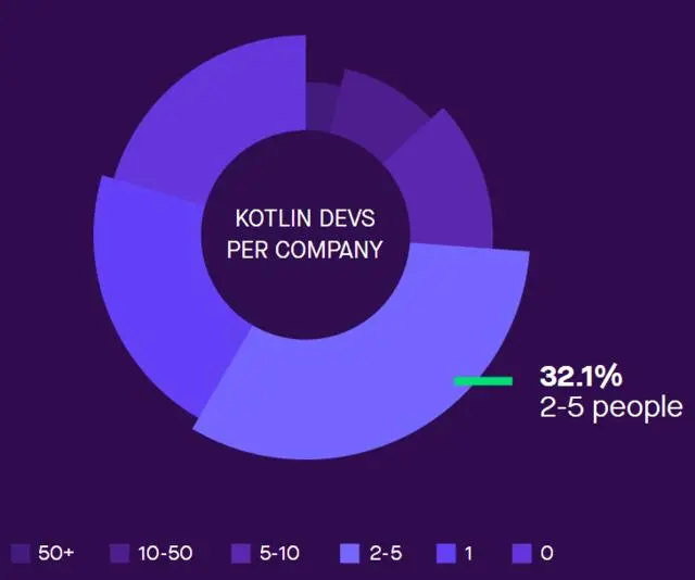 企业中使用 Kotlin 的开发者人数差异较大,大约三分之一的人表示,他们公司里 2-5 人使用 Kotlin 进行开发。这大致与开发 Android App 的团队规模相匹配。