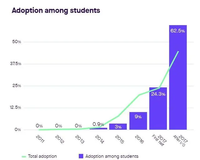 而 2017 年 5 月,Google 宣布 Kotlin 正式支持 Android,由此看出,大量 Android 开发者开始使用 Kotlin,占比达到了 46.8%。这其中不乏有因 Google 品牌吸引而投身于 Kotlin 开发的学生,据调查显示,早期,Kotlin 主要由经验丰富的专业开发者使用,如今大批年轻的开发者及学生开始涌入。