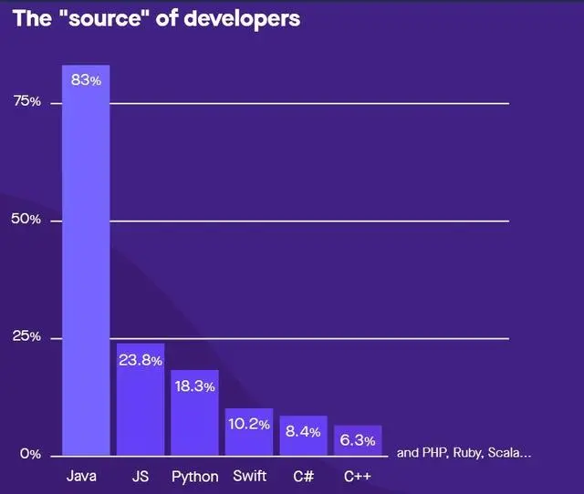 不过,目前 Java 仍占主要地位,同时也有很多开发者使用其他的编程语言,诸如 JavaScript、Python、Swift、C# 等等,因此大多数的开发者并没有将 Kotlin 作为其第一编程语言。