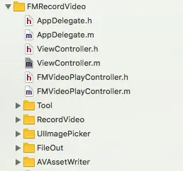 这是项目结构,我提前声明一下,那个RecordVideo文件中我是照着大神的FileOut文件中的代码敲得(也就是视频录制的第二种方法),里面有一些小改动。然后针对第三种方法的代码修改我都是直接在AVAssetWriter这个文件中直接改的。