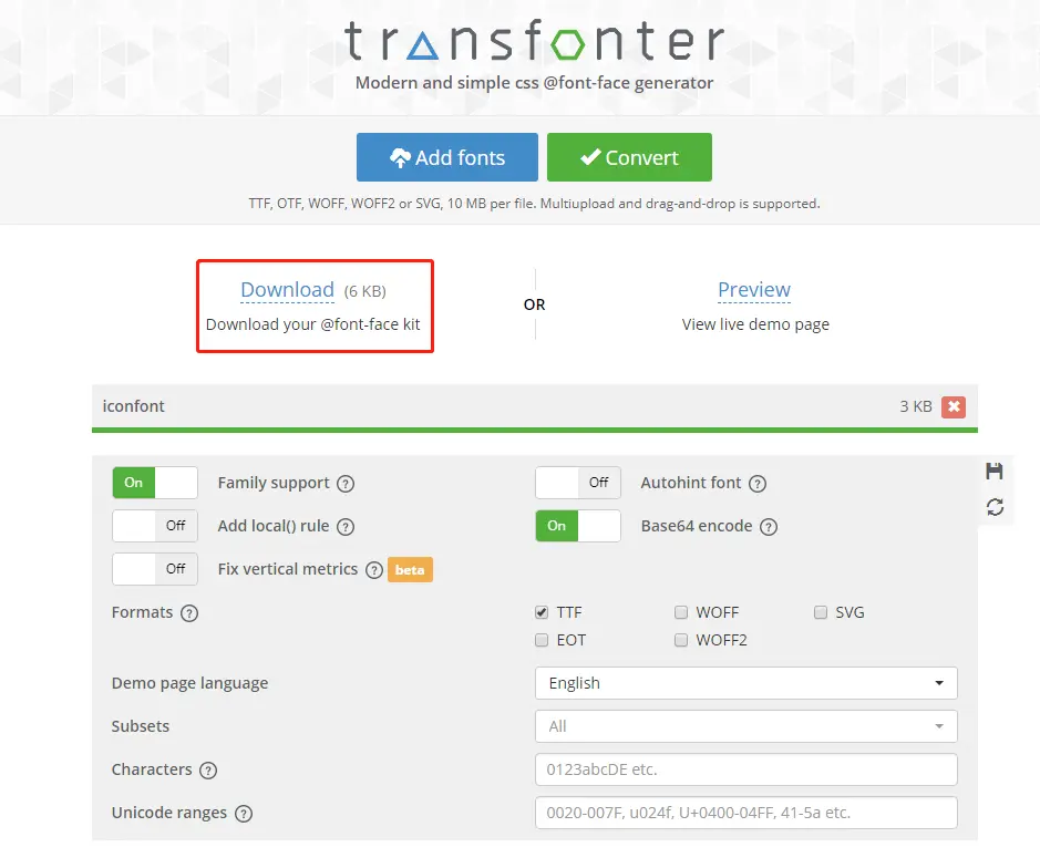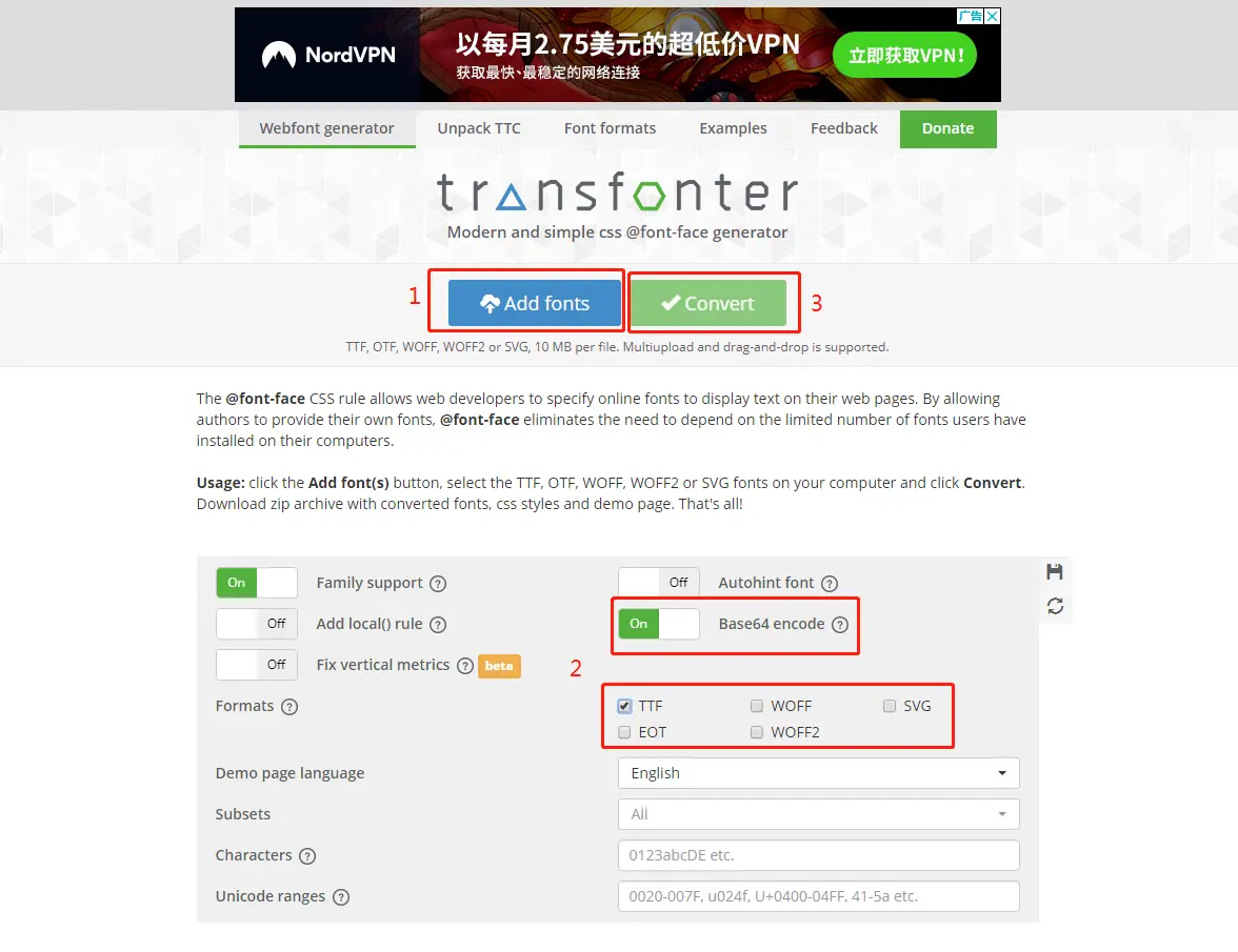 iconfont.ttf这个文件进行转码,将它转成base64格式,刚好 这个网站 就提供了这个功能(pass:这个网站可能会有点慢,可以的话代理加个速),按照下图的步骤,分别上传ttf文件,选择配置,点击转换。
