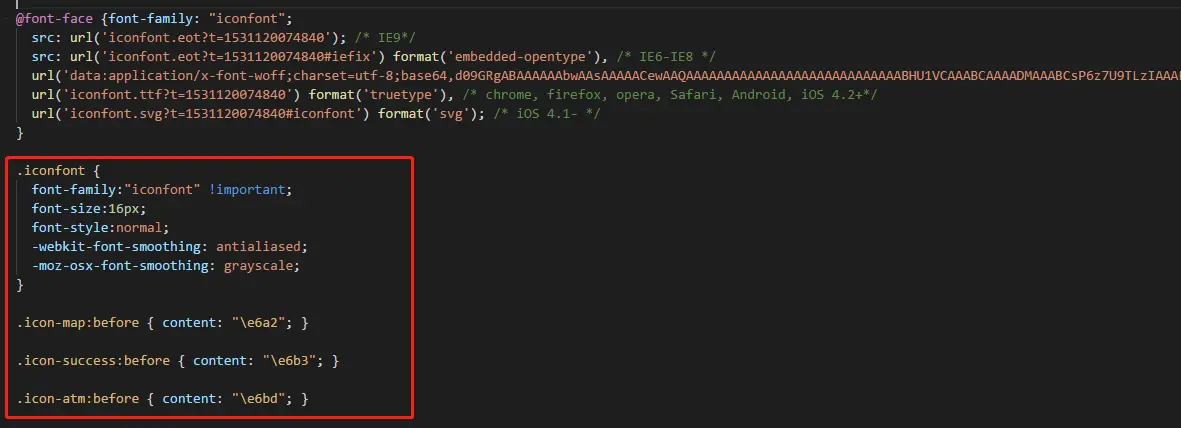 iconfont.wxss样式文件,将 上面解压出来的stylesheet.css里面的内容全部拷贝到iconfont.wxss中,另外,还记得我们上面说的iconfont.css吗?这时候就要派上用场了,我们打开iconfont.css这个样式文件,将下面的样式,也就是我用红框标注的内容复制到iconfont.wxss文件里,注意上面的不需要复制!!