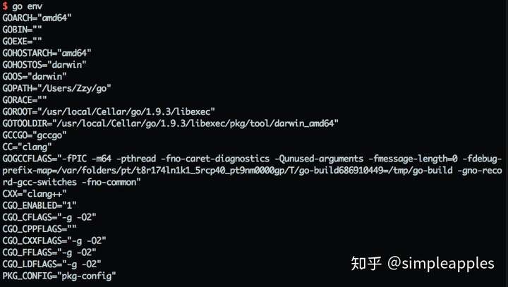 下载运行安装包后,在terminal中执行go env命令,如果出现下面的输出说明已经安装成功。