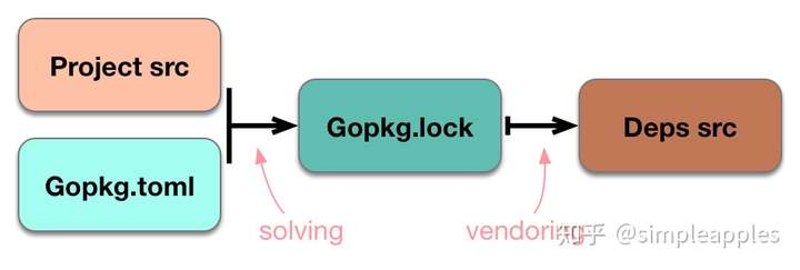 - solving功能,它将当前项目中的导入包和Gopkg.toml中的规则作为输入,不可变的依赖关系图作为传递完成后的输出,形成Gopkg.lock。