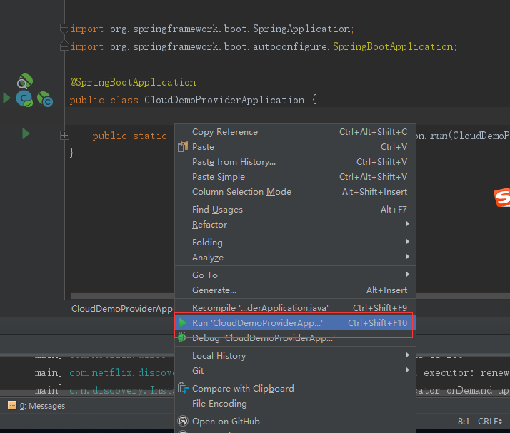 我们使用SpringBoot启动项目时一般都会使用此注解,一会启动项目的时候我们在这个类中右键选择run CloudDemoProviderApplication 就可以启动了